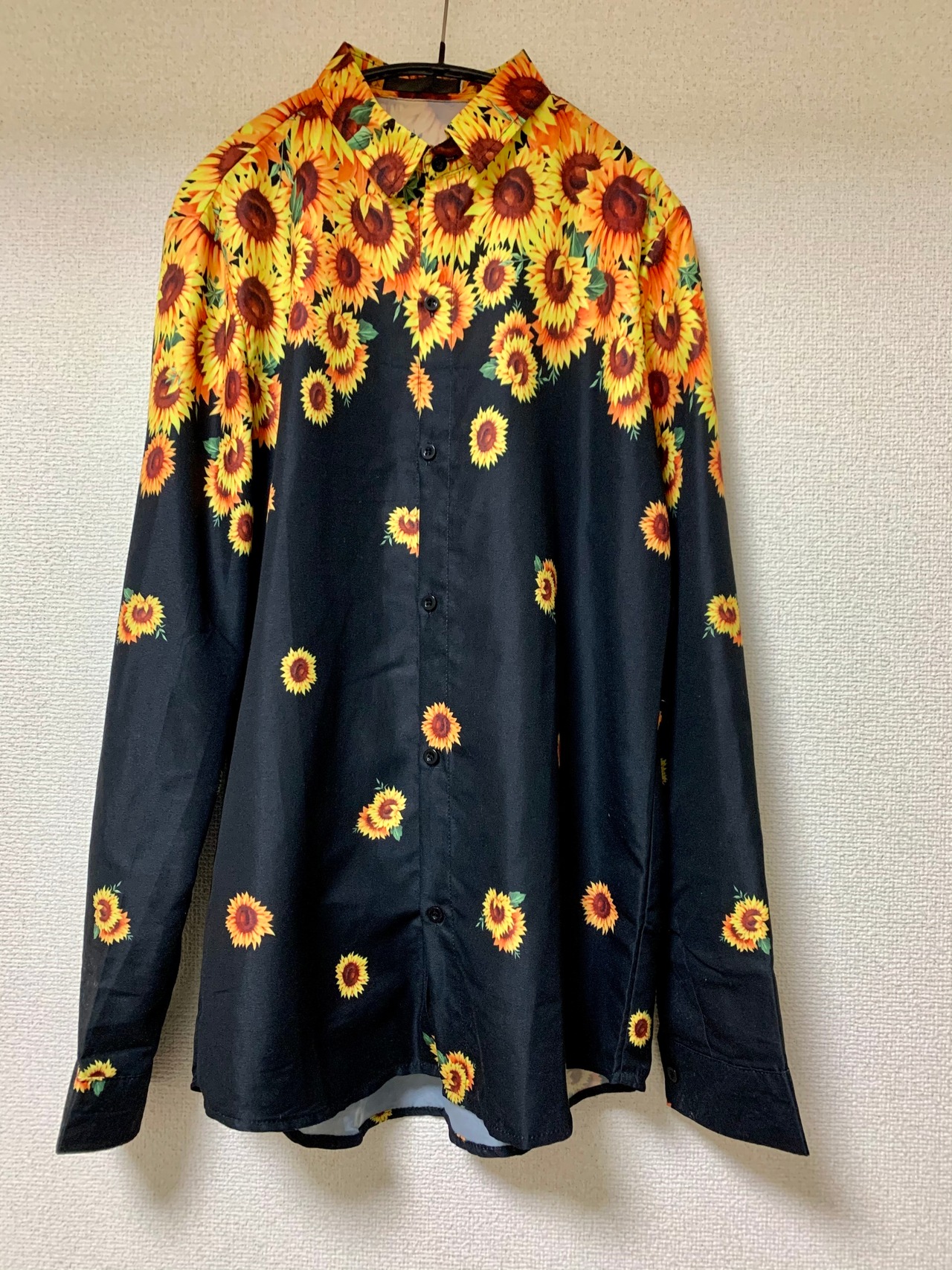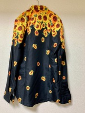 ひまわりが肩回りにあしらわれた柄シャツ。