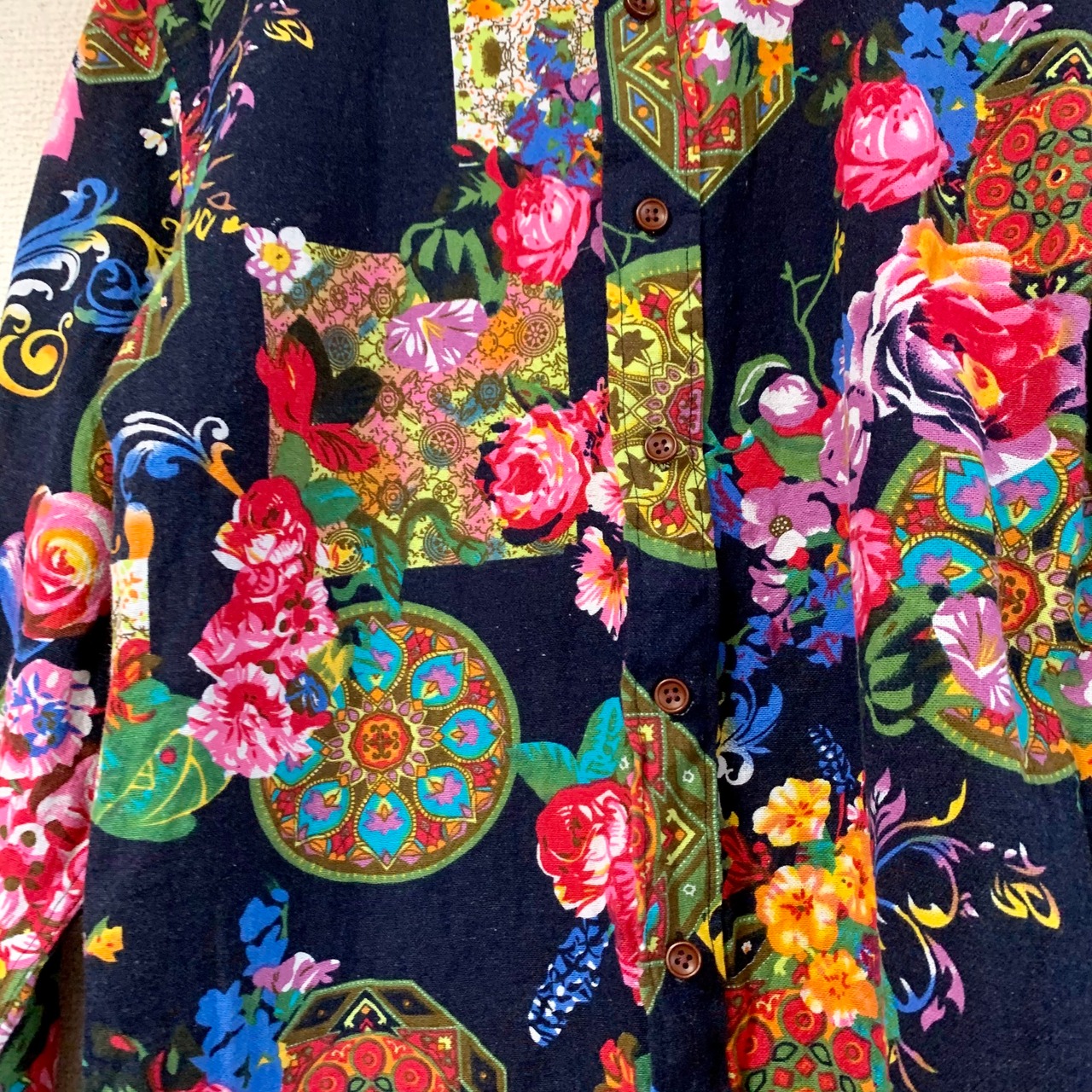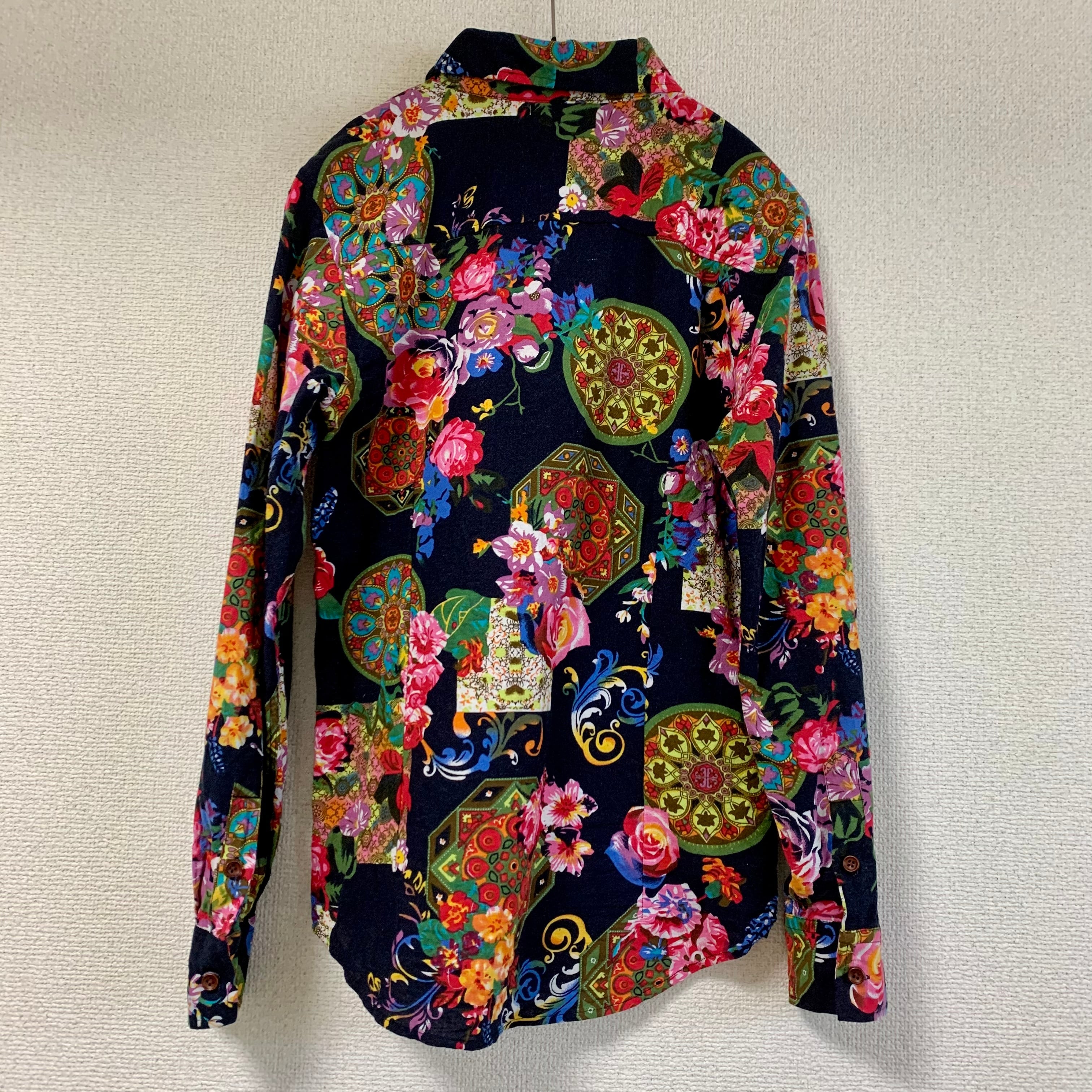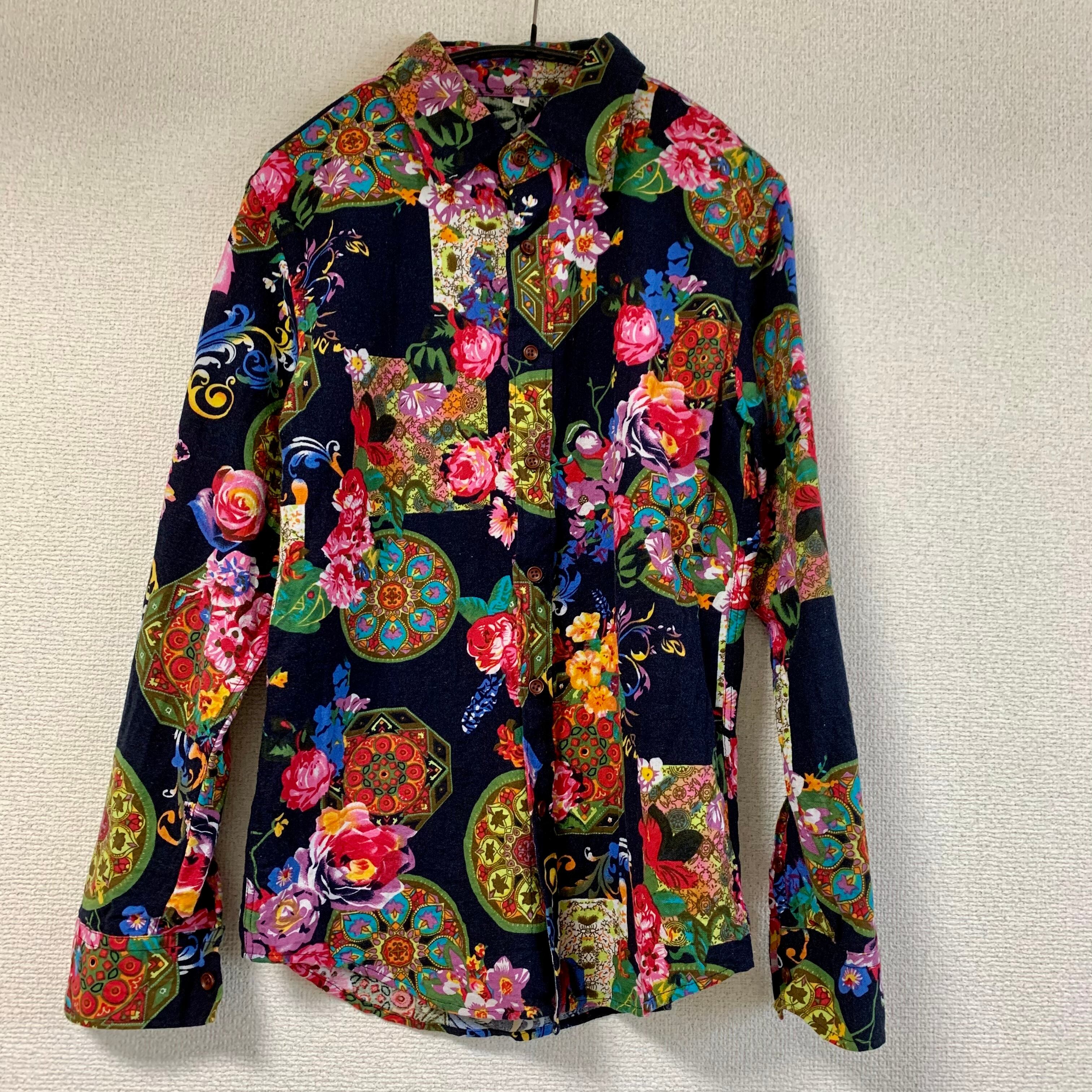 濃紺?黒地に色とりどりの花柄のシャツ。